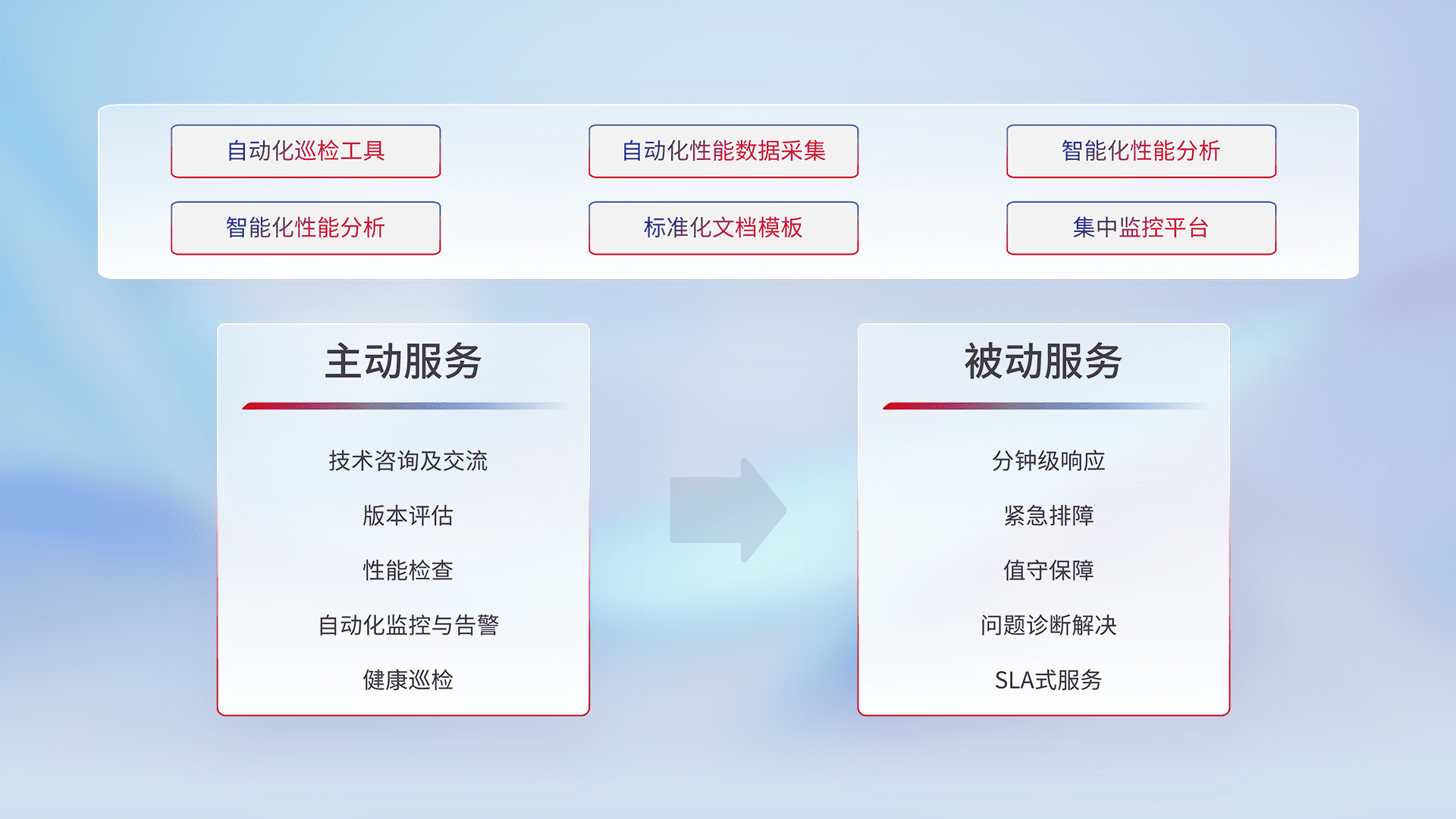 智能化工具和标准化文档,,,保障服务质量,,,,提供主动服务(包含技术咨询、、版本评估、、性能检查、、、、自动化监控与告警、、健康巡检)和被动服务包含(分钟级响应、、紧急排障、、、值守保障、、问题诊断解决、、、、SLA服务)。。