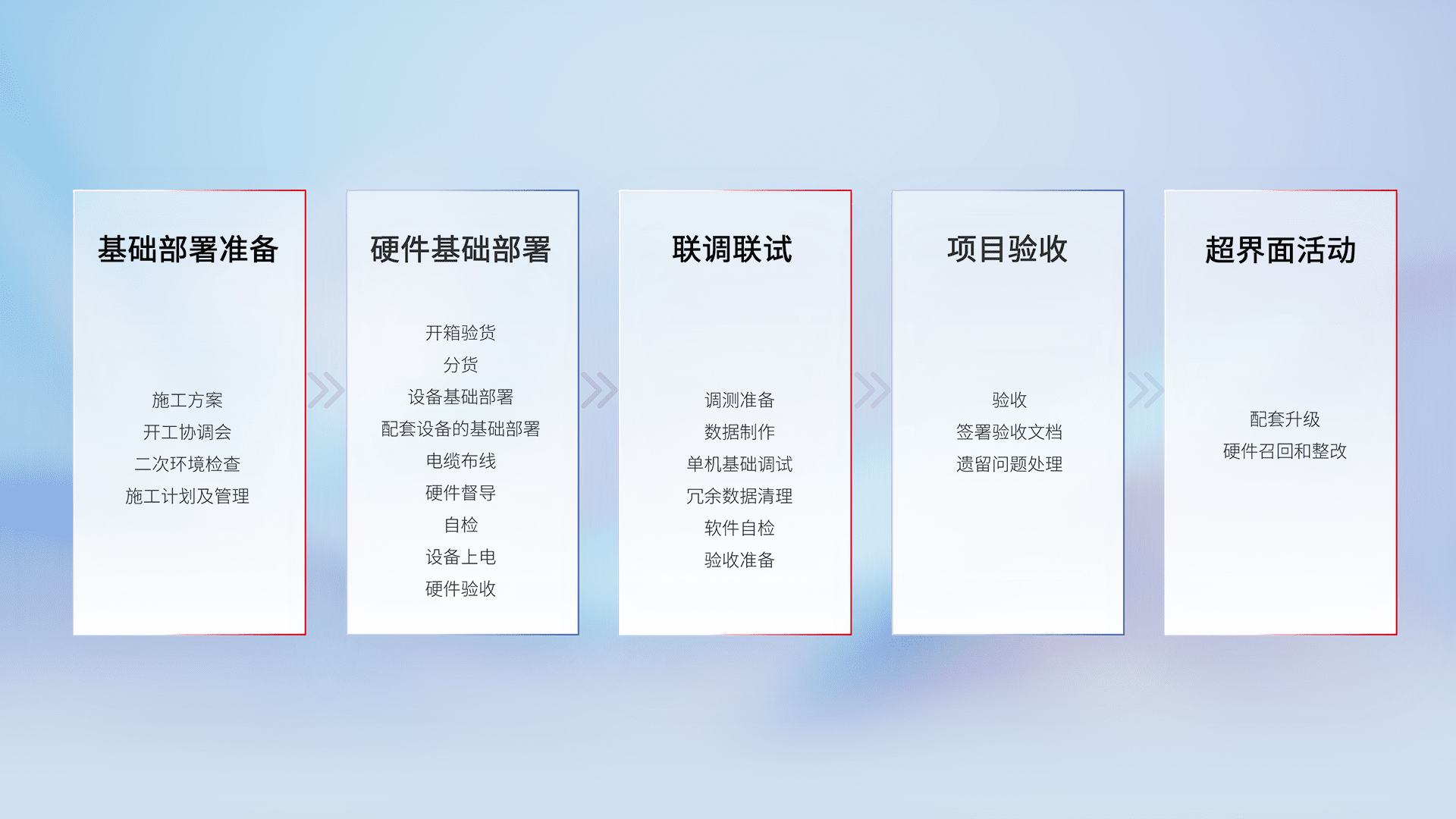 从基础部署准备、、、、硬件基础部署、、、联调联试、、、项目验收、、、越界面活动的全过程可追溯,,,保证施工质量和进度。。。。